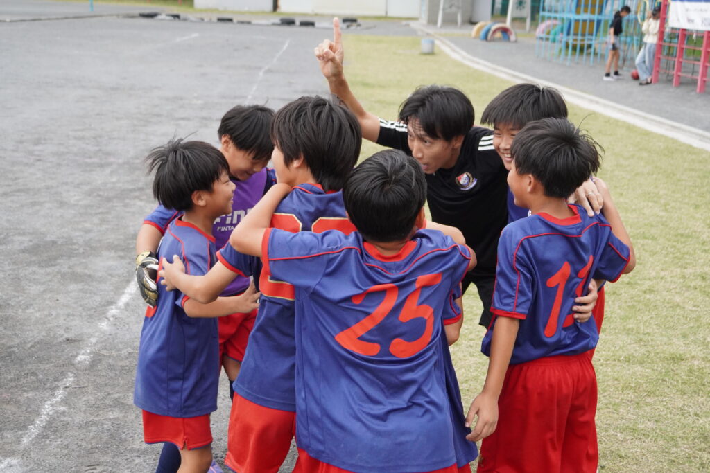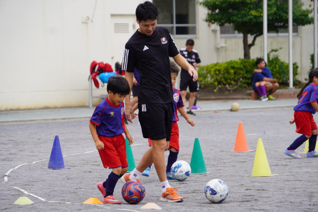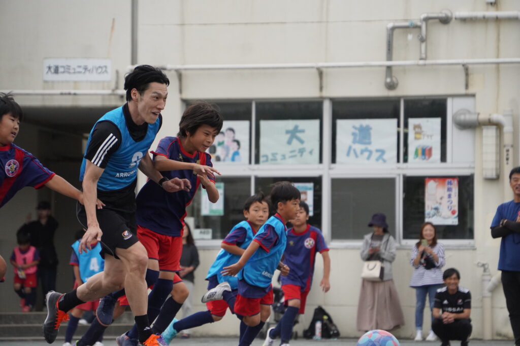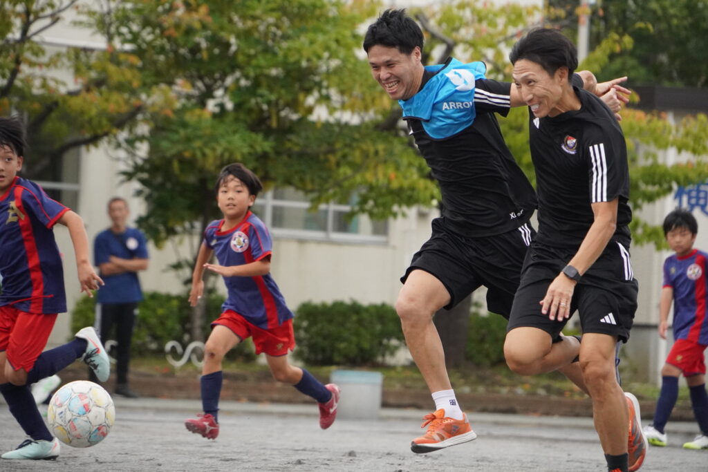 当日は3名のOB選手が参加し、子どもたちと一緒にパスやドリブル、クロスからのシュート練習などを行った後に、学年ごとに試合を実施。OB選手たちも子どもたちに負けじと積極的に練習に取り組み、技術面や精神面など、幅広い観点で子どもたちとコミュニケーションを取っていました。