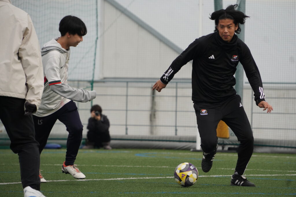 また最後はOB選手チーム対子どもたちの対抗戦も行いました。初めは遠慮気味にプレーしていた子どもたちでしたが、しだいに「勝ちたい」という意欲が出始め積極的に挑むようになり、最後にはOB選手たちも息を切らしながら取り組んでいたのが印象的でした。