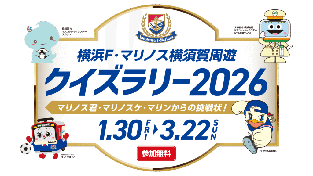1月30日(金)より横須賀市内のJR線・京急線の駅やスポットを巡りながら、クイズに挑戦する周遊型イベント「横浜F・マリノス横須賀周遊クイズラリー2026」を開催いたします。5箇所のラリースポットを設けた「港町のBLUEルート」と「情熱のREDルート」2つのルート上にある各スポットに設置された二次元コードを読み取り、クイズに答えてキーワードを完成させた先着3,000名さまに、参加賞引換場所にて「オリジナル パタパタメモ」をプレゼントいたします。さらにキーワード達成後、専用の応募フォームからご応募いただくと、抽選で選手サイン入り試合球や各社のオリジナルグッズなどをプレゼントいたします。ぜひご参加ください。