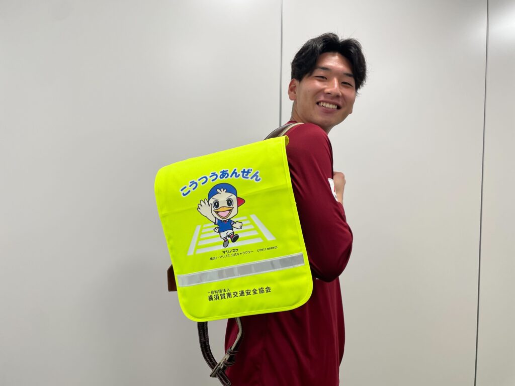 このたび、横浜F・マリノス、横須賀交通安全協会、田浦交通安全協会、横須賀南交通安全協会、横須賀市で連携して、横浜F・マリノスのデザインを取り入れたランドセルカバーを作成し、令和8 年度に横須賀市内44校の市立小学校等へ入学する約2,250名の新小学1 年生へ配布することとなりましたので,クラブ公式キャラクター「マリノスケ」と、横須賀市出身の木村凌也選手のコメントとあわせてお知らせいたします。