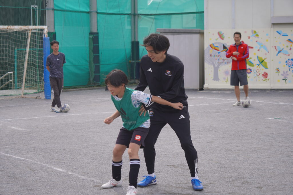 試合形式のトレーニングでは、秋元さんはパントキック・下平さんは華麗なテクニックを魅せて、子どもたちだけでなくコーチや保護者からも多くの感嘆の声が上がり、会場全体が一体感に包まれました。