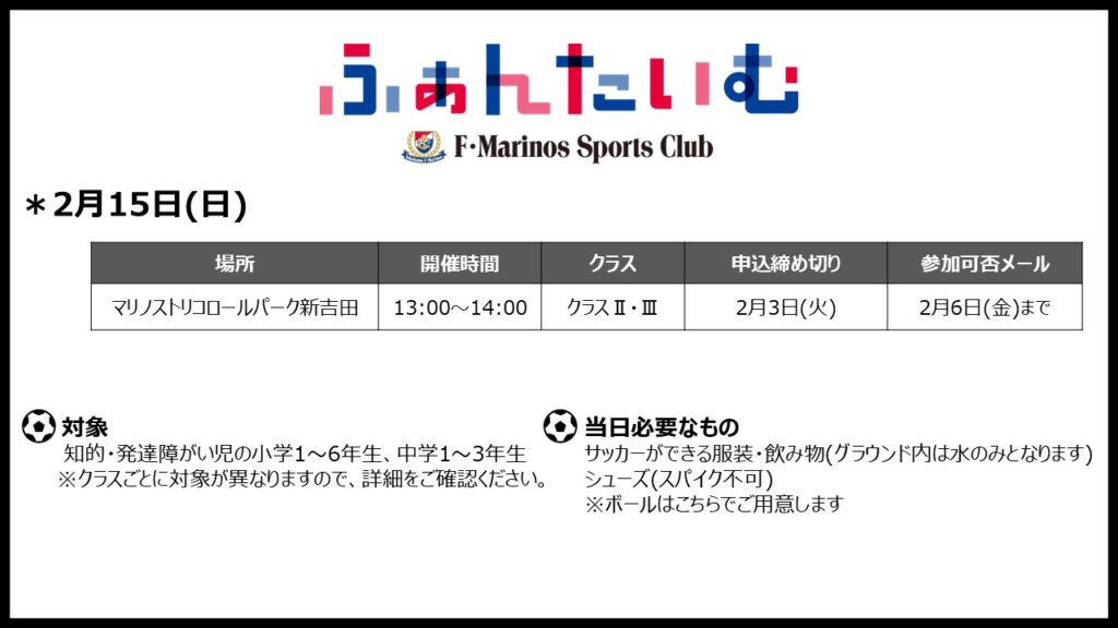F・マリノススポーツクラブでは、知的・発達障がい児を対象にしたサッカー教室「ふぁんたいむ」を実施いたします。普段身体を動かす機会がない方、サッカーを始めたい方や、サッカーが大好き、もっと上手くなりたい方などを対象に楽しみながら活動します。みなさまのご参加お待ちしております。