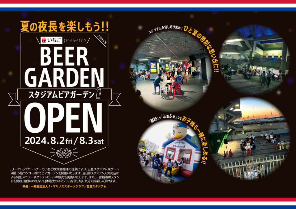 このたび、日産スタジアムのお近くにお住まいの皆様やファン・サポーターの皆様に楽しんで頂きたく、Jリーグトップパートナーのいちご株式会社様の提供により、「いちごpresentsスタジアムビアガーデン」を日産スタジアム東ゲート4階・5階コンコースにて開催いたします。
